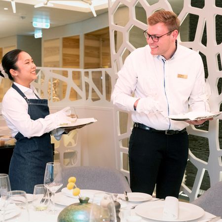 Ob Chef de Rang auf der Flotte von Hapag-Lloyd Cruises, Barkeeper auf der Mein Schiff Flotte, Restaurant Steward auf einem Flussschiff oder Bar Manager auf der Flotte von Phoenix Reisen - Mit uns findest du alle Einstiegslevel und Weiterbildungsmöglichkeiten im Bereich Restaurant und Bar. Vom Kellner bis zur Restaurantleitung ist vieles möglich.