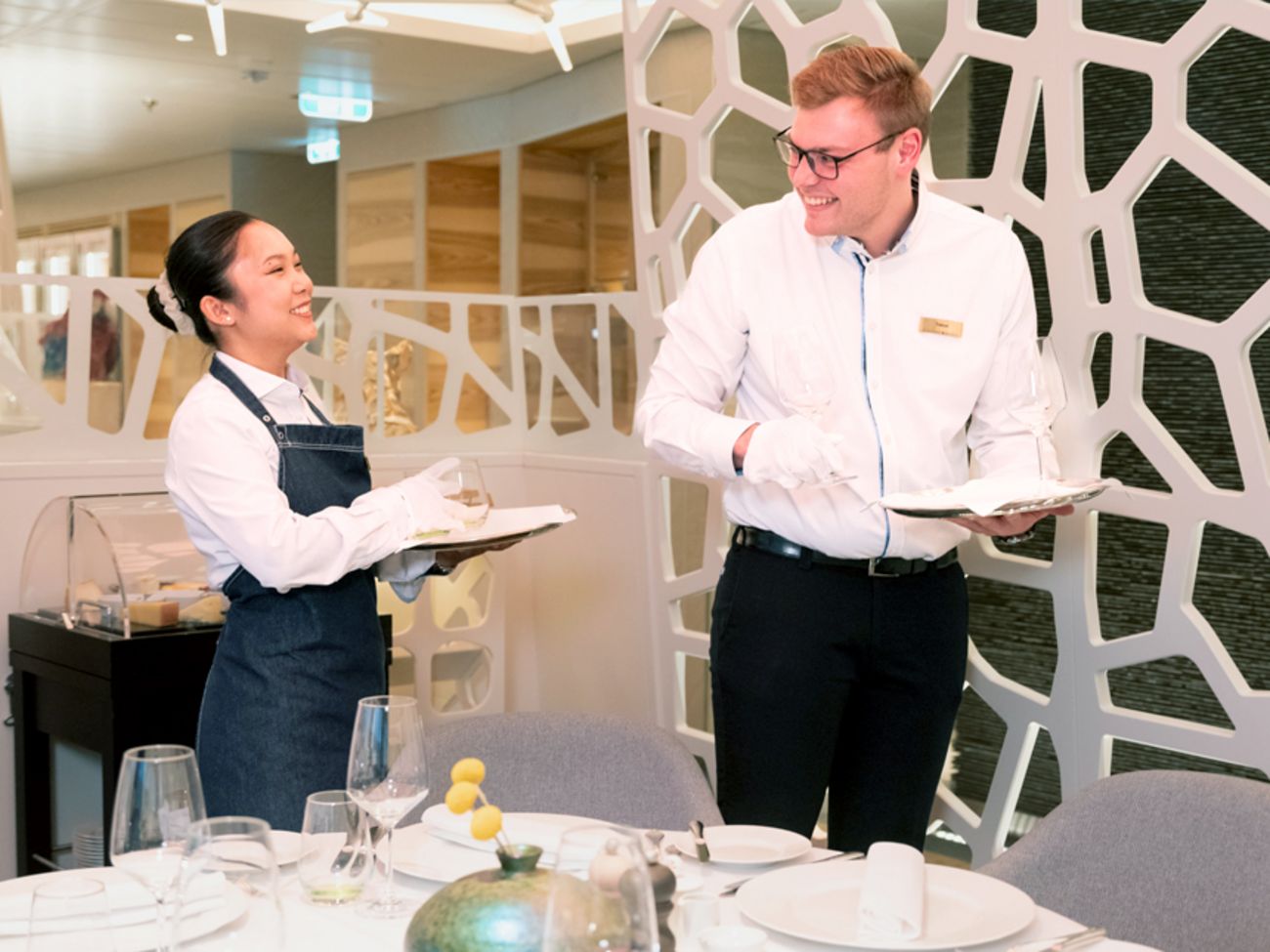 P: Mein Name ist Patsana. Ich bin gelernte Hotelfachfrau und ich arbeite als Chef de Rang an Bord. Meine Aufgabe ist es, die Gäste im Servicebereich zu betreuen sowie natürlich auch die Restaurants für die einzelnen Servicezeiten vorzubereiten.